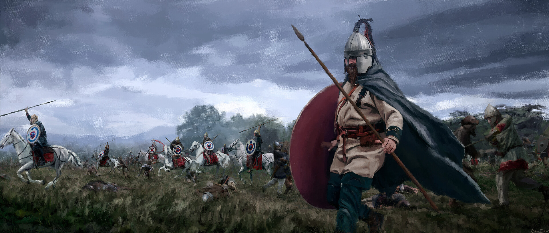 uses his scutum in a typically offensive fashion to topple a Roman triarius (right) at the Battle of